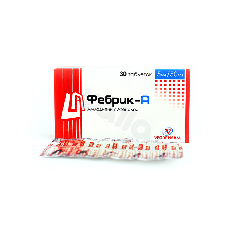 Фебрик-А – комбинированный препарат, эффект которого обусловлен действием двух компонентов – бета1-адреноблокатора (атенолол) и БМКК (амлодипин), оказывает гипотензивное, антиангинальное, антиаритмическое действие.