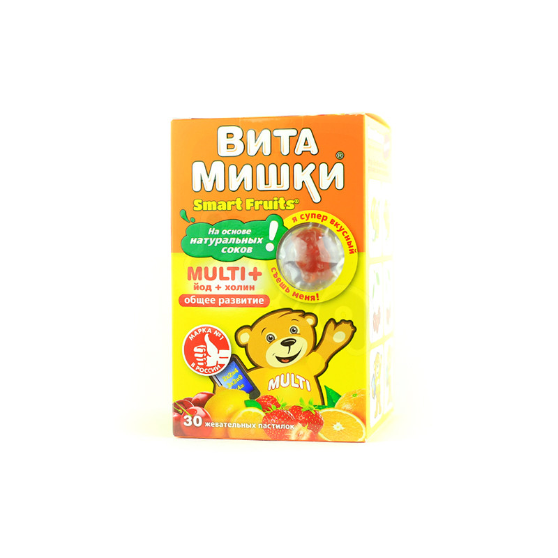 ВитаМишки® Multi , йод , холин – жевательные мармеладные пастилки в форме фигурок мишек с клубничным, апельсиновым, вишневым и лимонным вкусом.